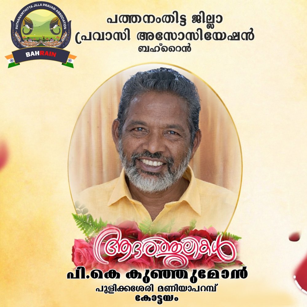 ബഹ്റൈൻ പത്തനംതിട്ട ജില്ലാ പ്രവാസി അസോസിയേഷൻ്റെ പ്രസിഡൻ്റ് വിഷ്ണു ദേവഞ്ജനത്തിൻ്റെ ഭാര്യാ പിതാവ്, എക്സിക്യൂട്ടീവ് കമ്മിറ്റി അംഗവും മെഡിക്കൽ കോർഡിനേറ്ററും ആയ അഞ്ജു വിഷ്ണുവിൻ്റെ പിതാവ് പി കെ കുഞ്ഞുമോൻ, പുളിക്കശ്ശേരി, മണിയാപറമ്പ്, കോട്ടയം നിര്യാതനായ വിവരം വ്യസന സമേതം അറിയിക്കുന്നു.......